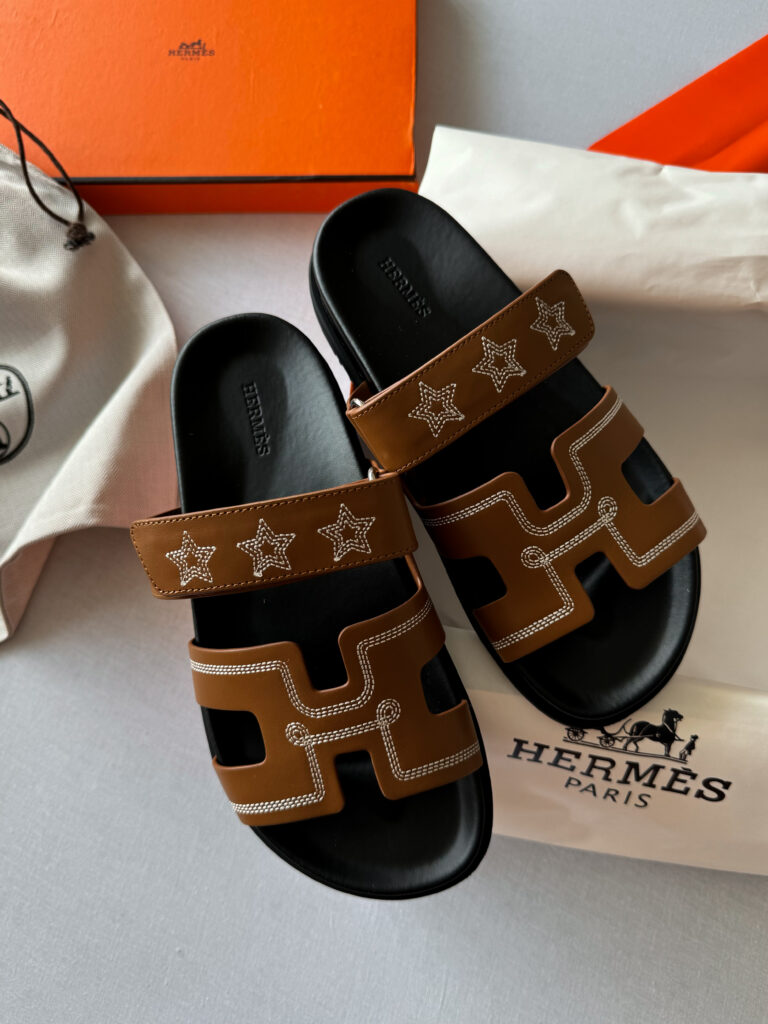 Hermes Chyrpe Brown Stars pantofle z kůže