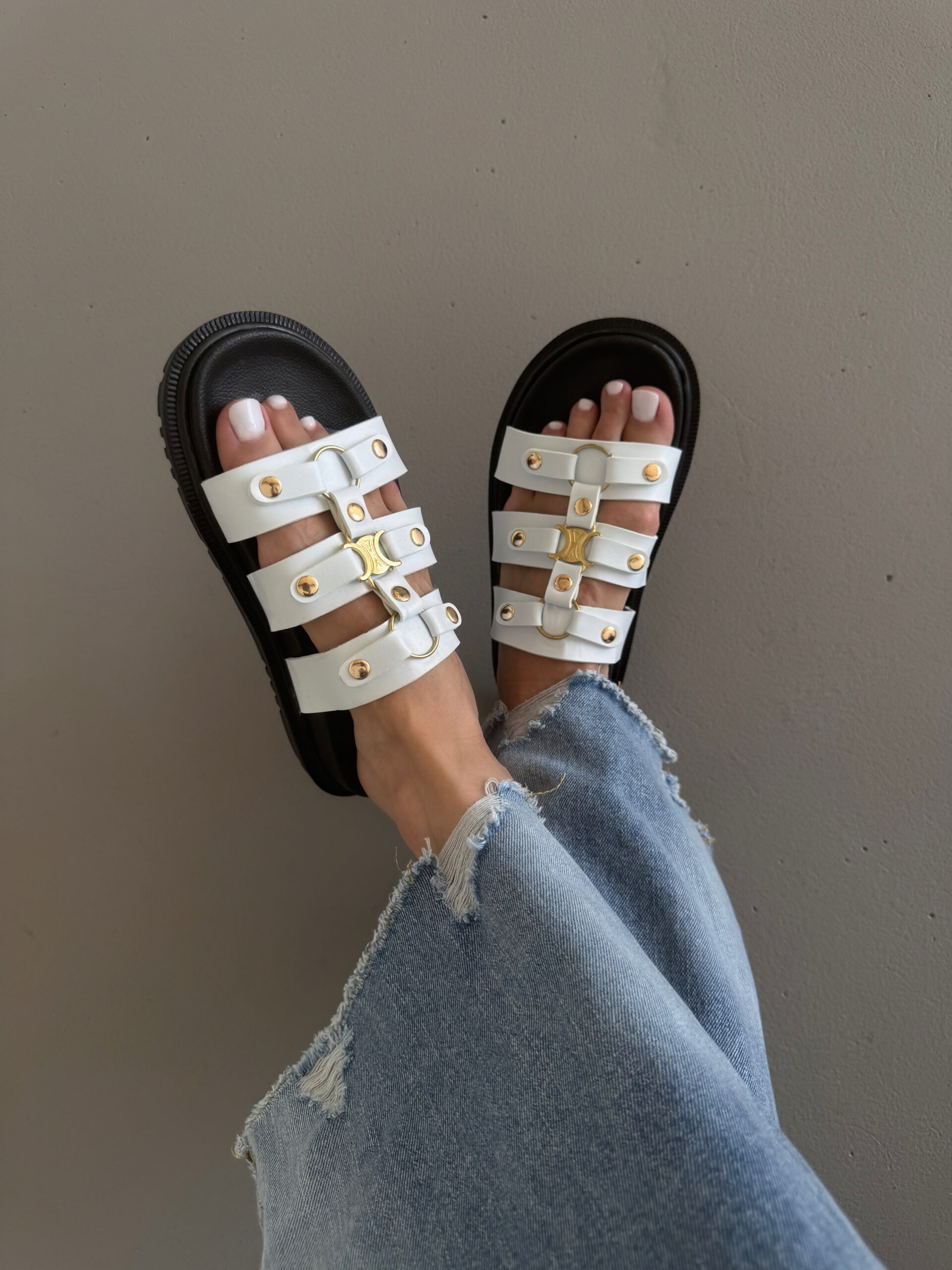CELINE TIPPI SLIDES White/Black — стильні та комфортні капці з натуральної шкіри, виготовлені в Туреччині. Ідеально підходять для щоденного носіння, прогулянок чи відпочинку вдома. М’яка шкіра забезпечує зручність та довговічність, а сучасний дизайн поєднує білий та чорний кольори, що додає елегантності та універсальності. Оберіть CELINE для комфорту, стилю та якості, яку відчуваєш від першого кроку.